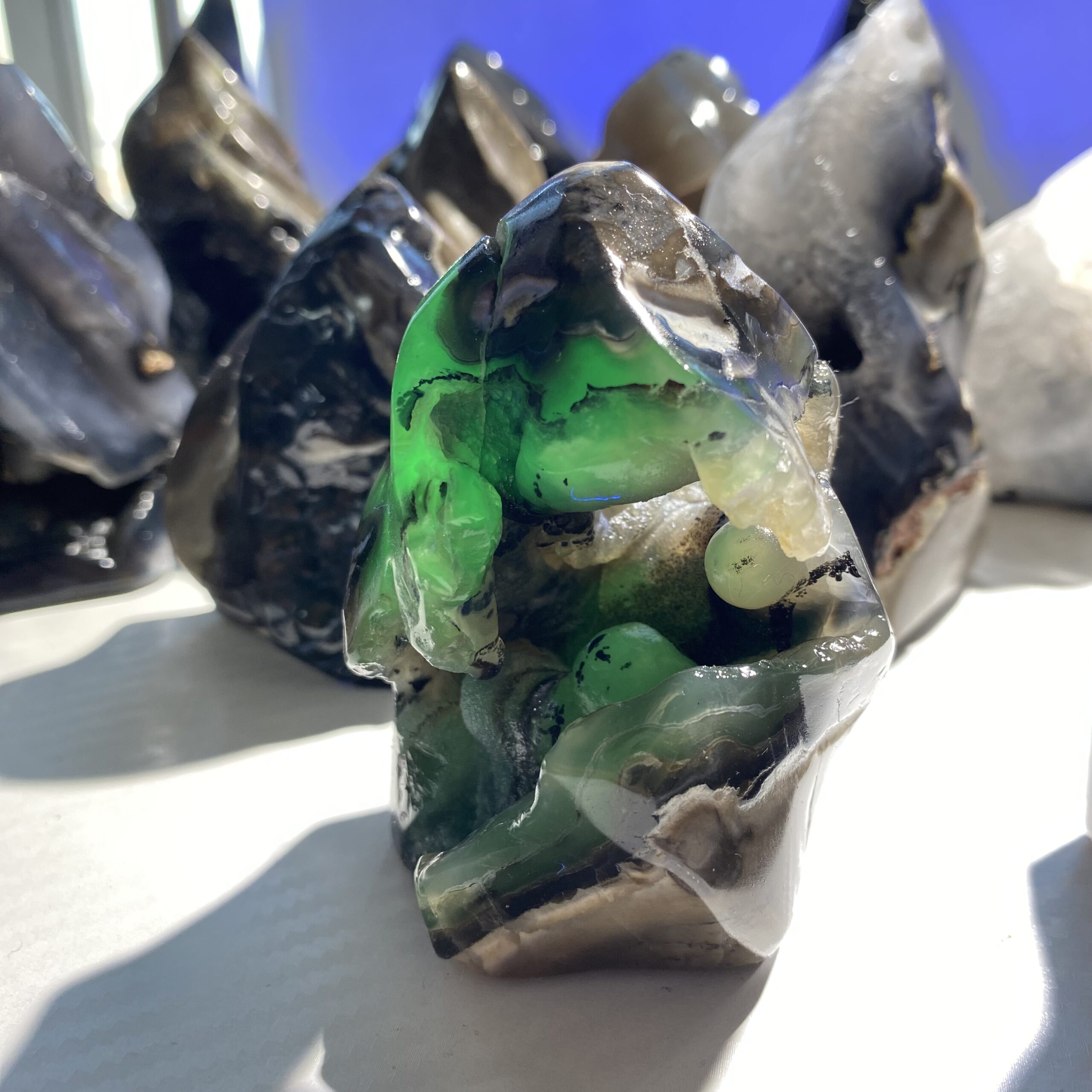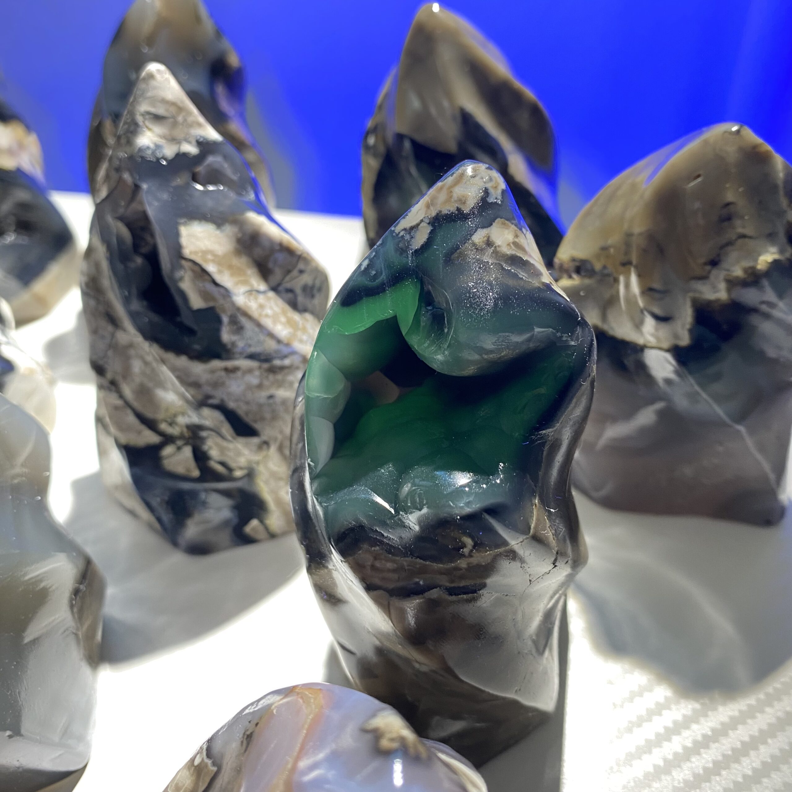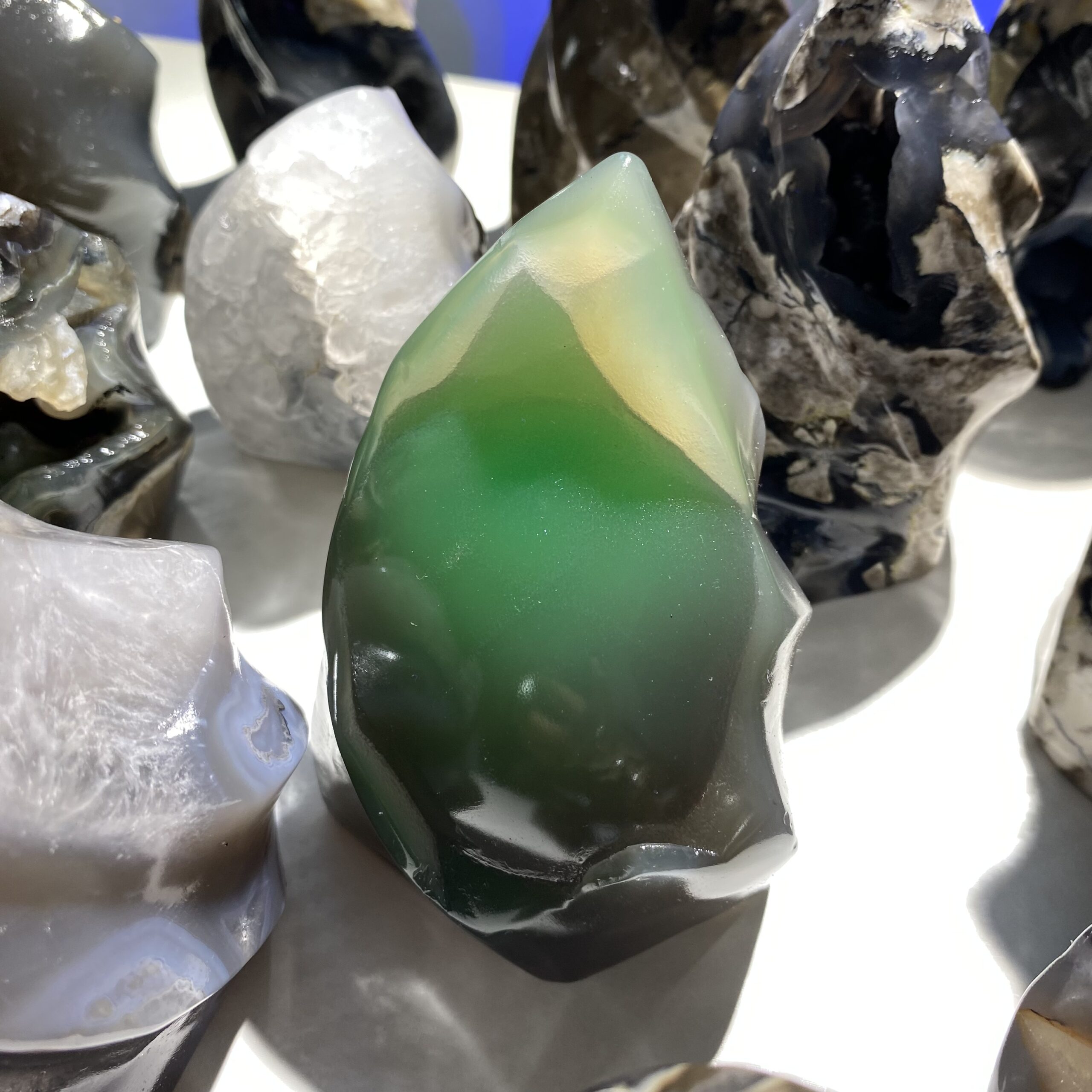 Feng Shui: In feng shui theory, green represents vitality, vigor and growth. Fluorescent green agate is believed to have a positive aura and can promote career development, academic progress and harmonious interpersonal relationships. Placing it in the wealth position or the Wenchang position in the living room is said to enhance one’s financial fortune and academic luck. In addition, placing fluorescent green agate in the bedroom can also help create a warm and harmonious atmosphere and enhance the relationship between husband and wife. However, the claims related to feng shui are more of a cultural tradition and psychological sustenance. Currently, there is no scientific basis to confirm their actual effects.