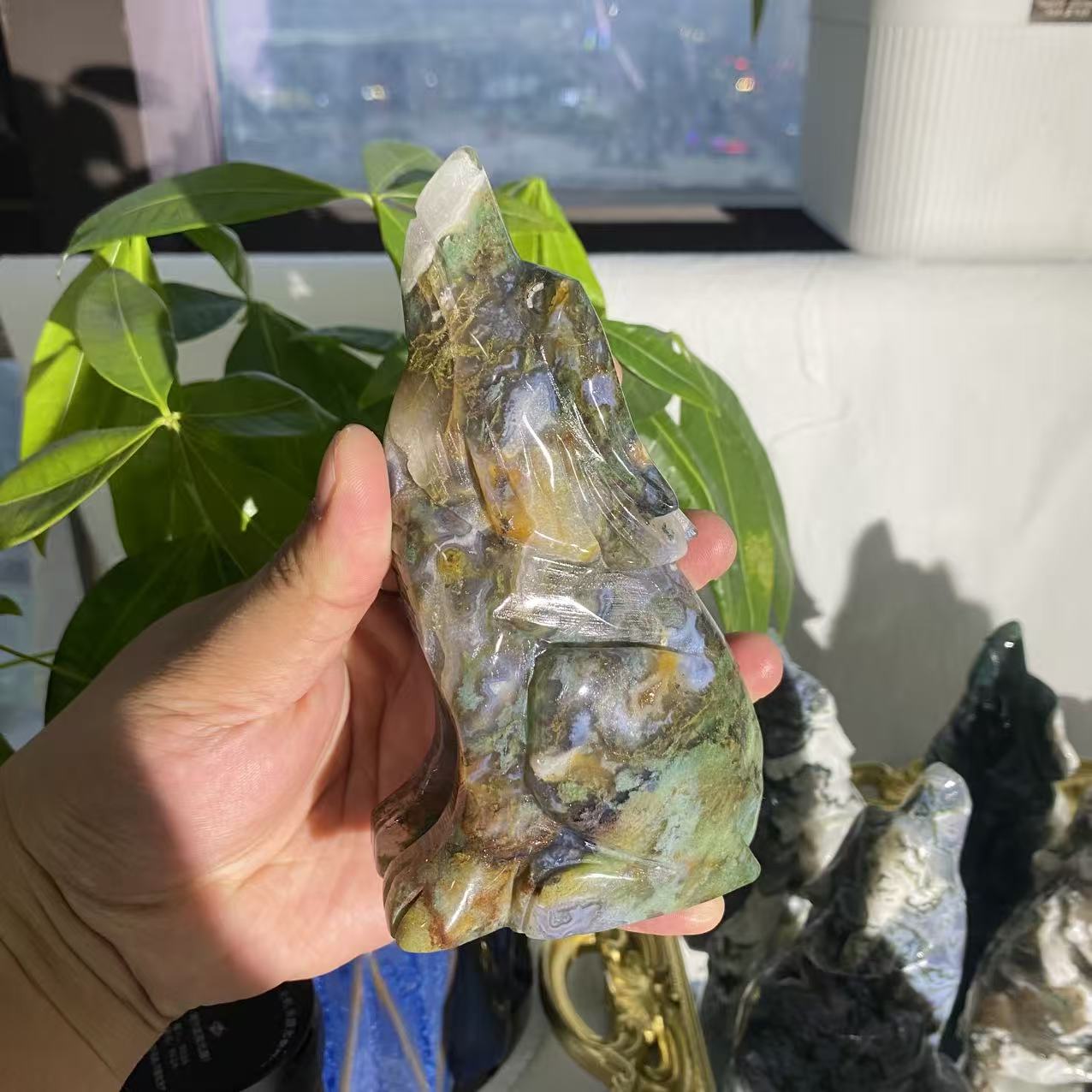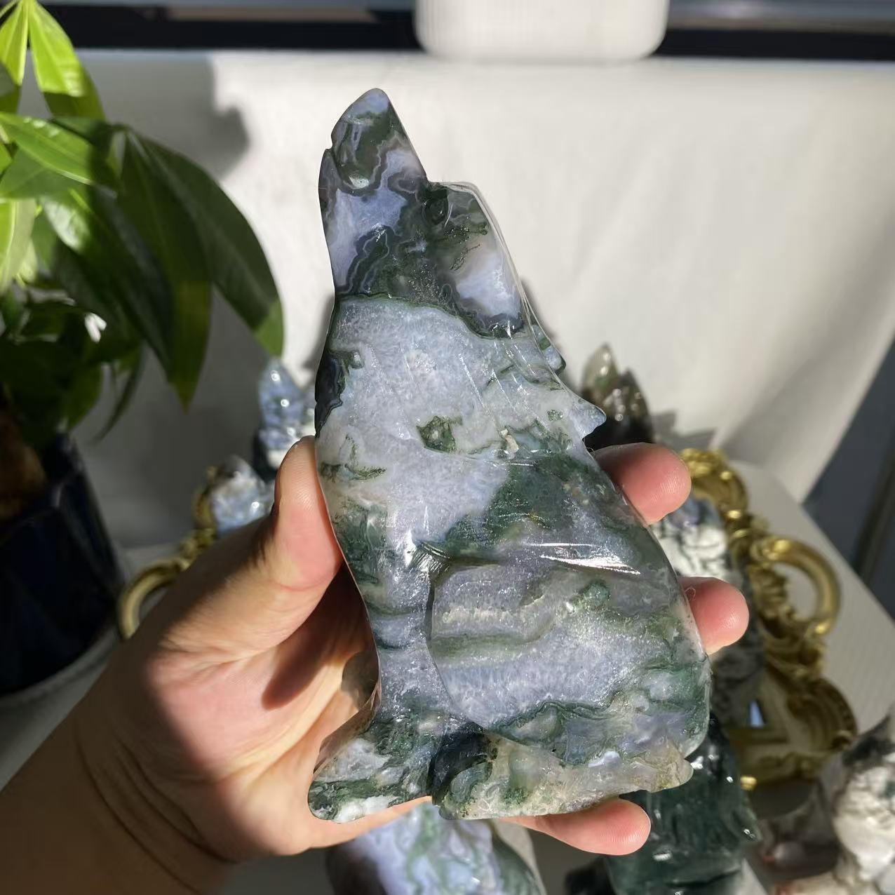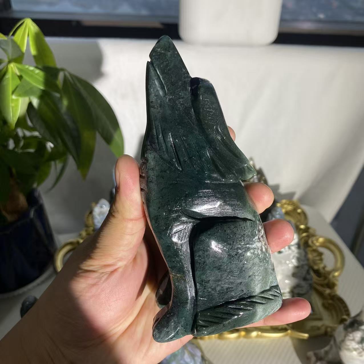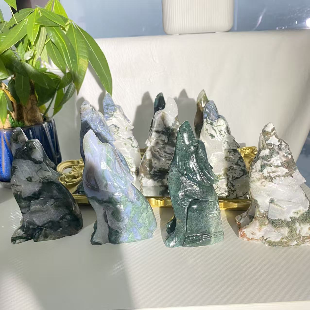 Home CARVING & CRAFT Natural Moss Agate Wolf Carving – Forest Spirit Guardian with Natural Inclusions Random Delivery Wholesale Crystal